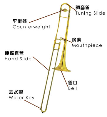 The trombone consists of 2 separate pieces. One of them is made up of the mouthpiece, the cylindrical bore and the bell. Another one is a U-shaped slide that can be moved toward and away from the player. The slide, which performs a comparable function as the valves used in other brass instruments, is capable of producing a smooth "glissando" by a sliding movement. |