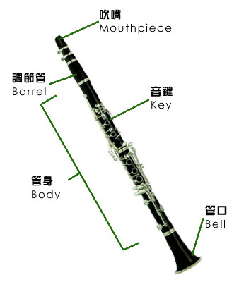 The modern clarinet is made of wood or ebonite, of cylindrical bore, with a bell-shaped opening at one end and a plastic ebonite mouthpiece at the other. The single cane reed is bound to the open side of the mouthpiece by means of a metal ligature with thumbscrews.