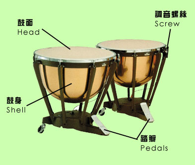 The word "timpani" derives from a Greek word that means to strike. The timpani are pitched instruments, which consist of hemispherical-shaped shells of copper or brass, over which are stretched the heads of calfskin. Pitches may be varied by changing the tension at the head by means of the 6 surrounding screws or the foot pedal. The drumsticks of the timpani are usually wrapped with felt or sponge in order to achieve different sound effects.